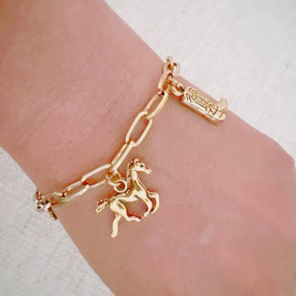 Complete your rodeo-ready look with this gold-tone cowgirl charm bracelet featuring western favorites: a cactus, cowboy hat, horseshoe, boot, and more. Designed on a trendy chain link, it’s the perfect accessory for adding a playful western twist to any outfit. ✔ Cowgirl Chic – Detailed charms for a rustic, stylish vibe ✔ Stacks Beautifully – Great for mixing with other bracelets ✔ Style-Ready – Easy to wear day or night Dimensions: Approximately 6.5\" with 1\" extender Materials: Gold plated Lead and nickel free Imported