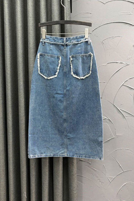 Distressed denim midi skirtOpen slit in frontDistressing on back pockets