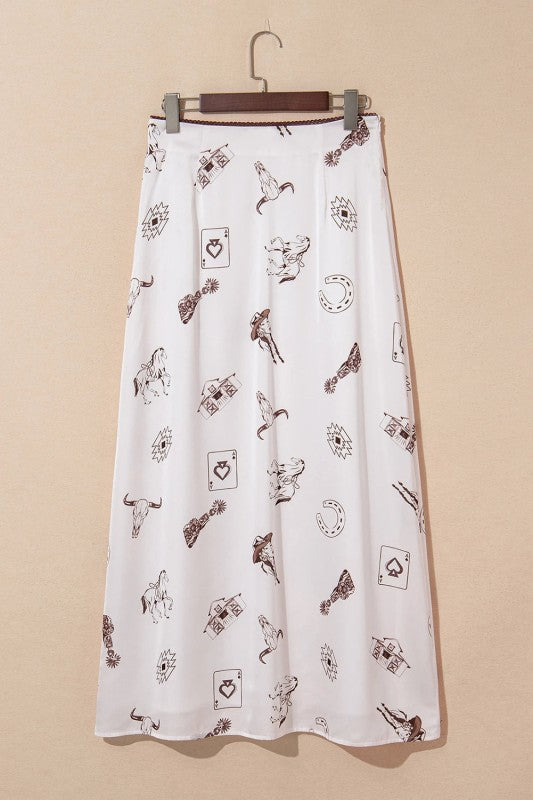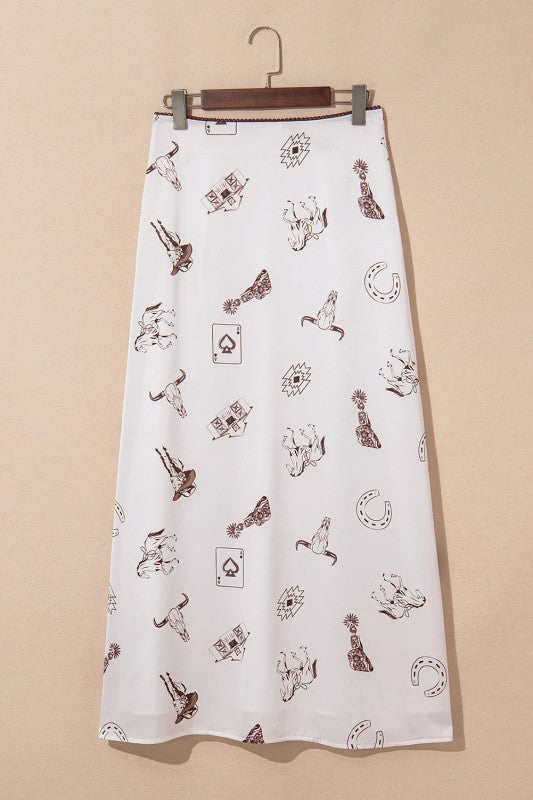 Slip into effortless elegance with this skirt that feels as luxurious as it looks. The western-inspired print adds a dash of personality and charm, while the high waist and flowing maxi length create a graceful, flattering silhouette. Smooth, silky fabric drapes beautifully against your skin, making it the perfect companion for casual tees, fitted tanks, or crisp button-ups. Whether you're channeling cowgirl chic or just want to add some flair to your everyday rotation, this skirt delivers style with serious comfort. Polyester/Spandex