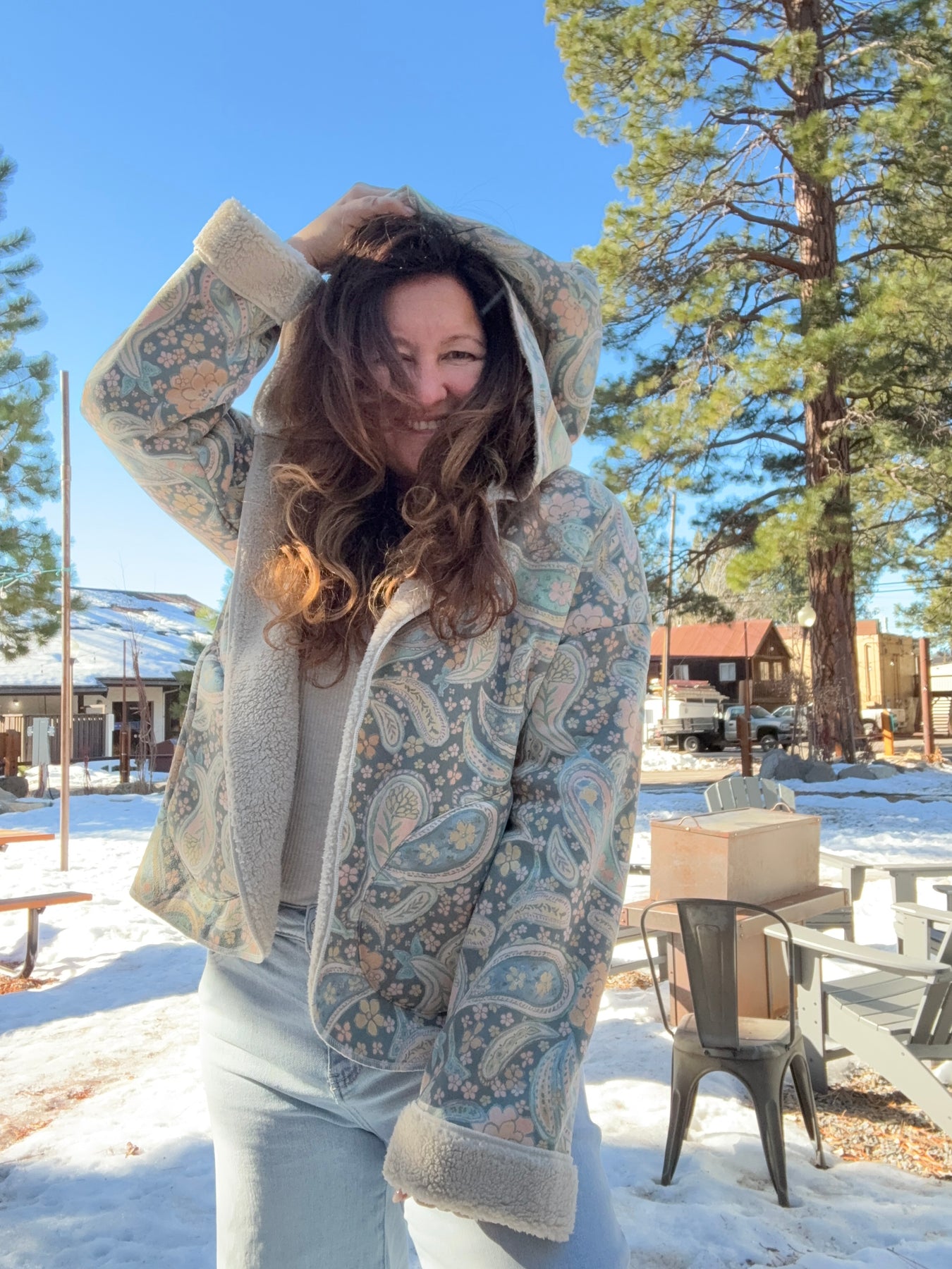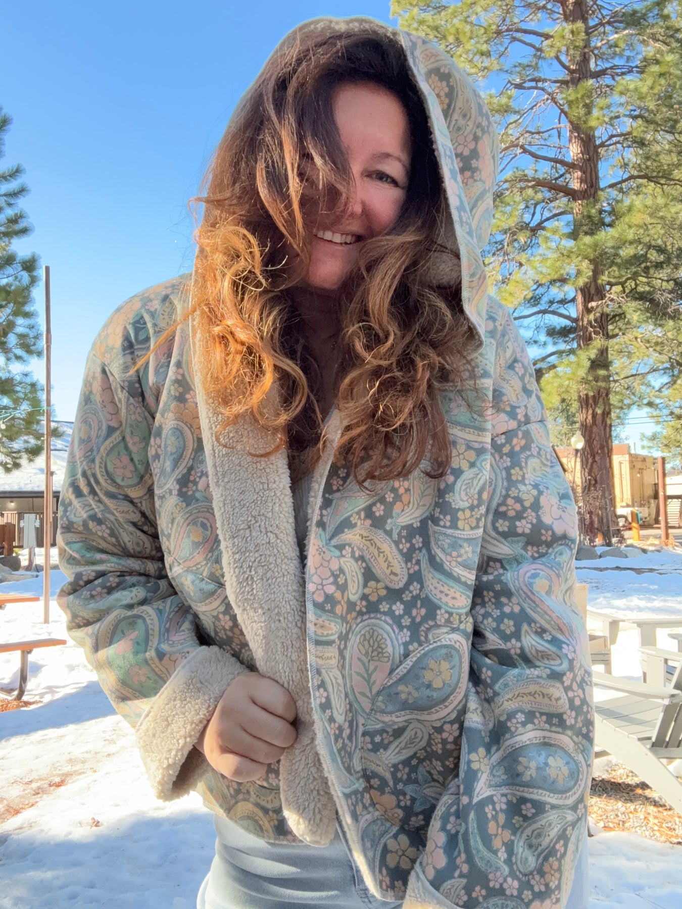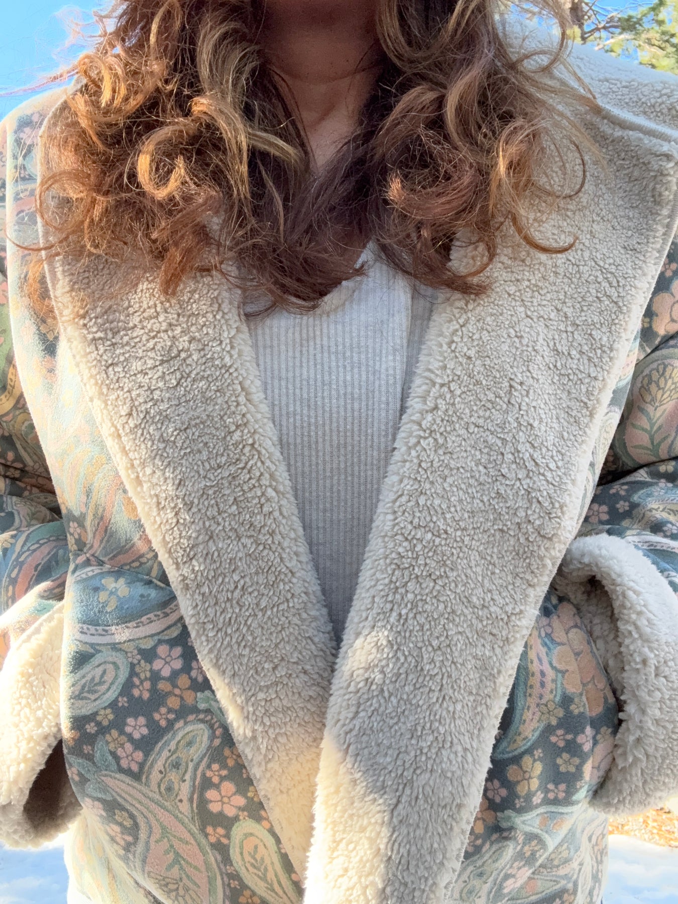 Keep cozy this fall with the Long Sleeve Hooded Jacket, designed with printed faux suede in a paisley floral print and a plush sherpa lining. The cozy shawl collar, patch pockets, and hood make it a comfortable and stylish option for cooler days.