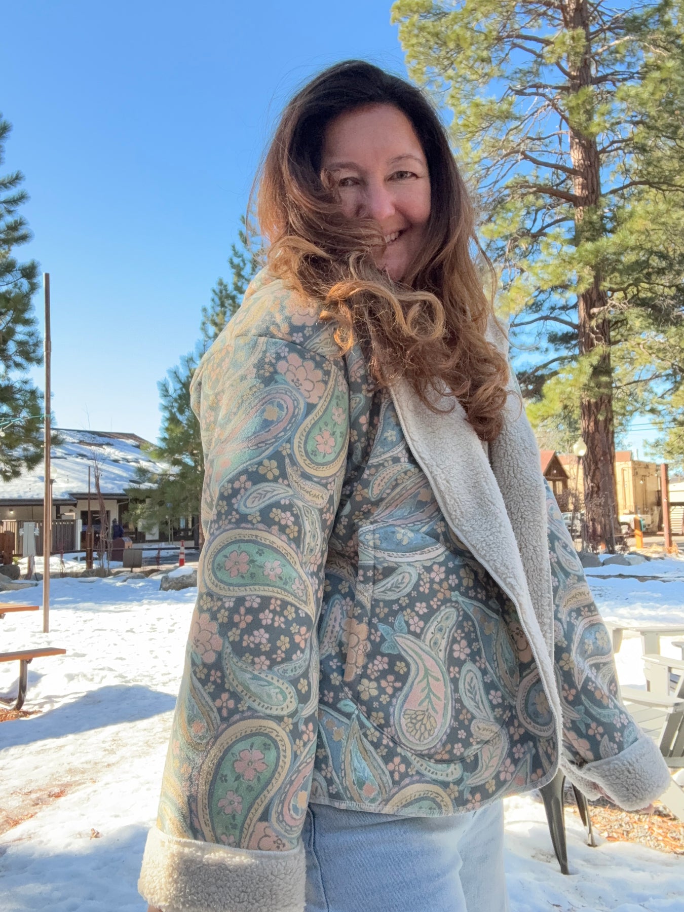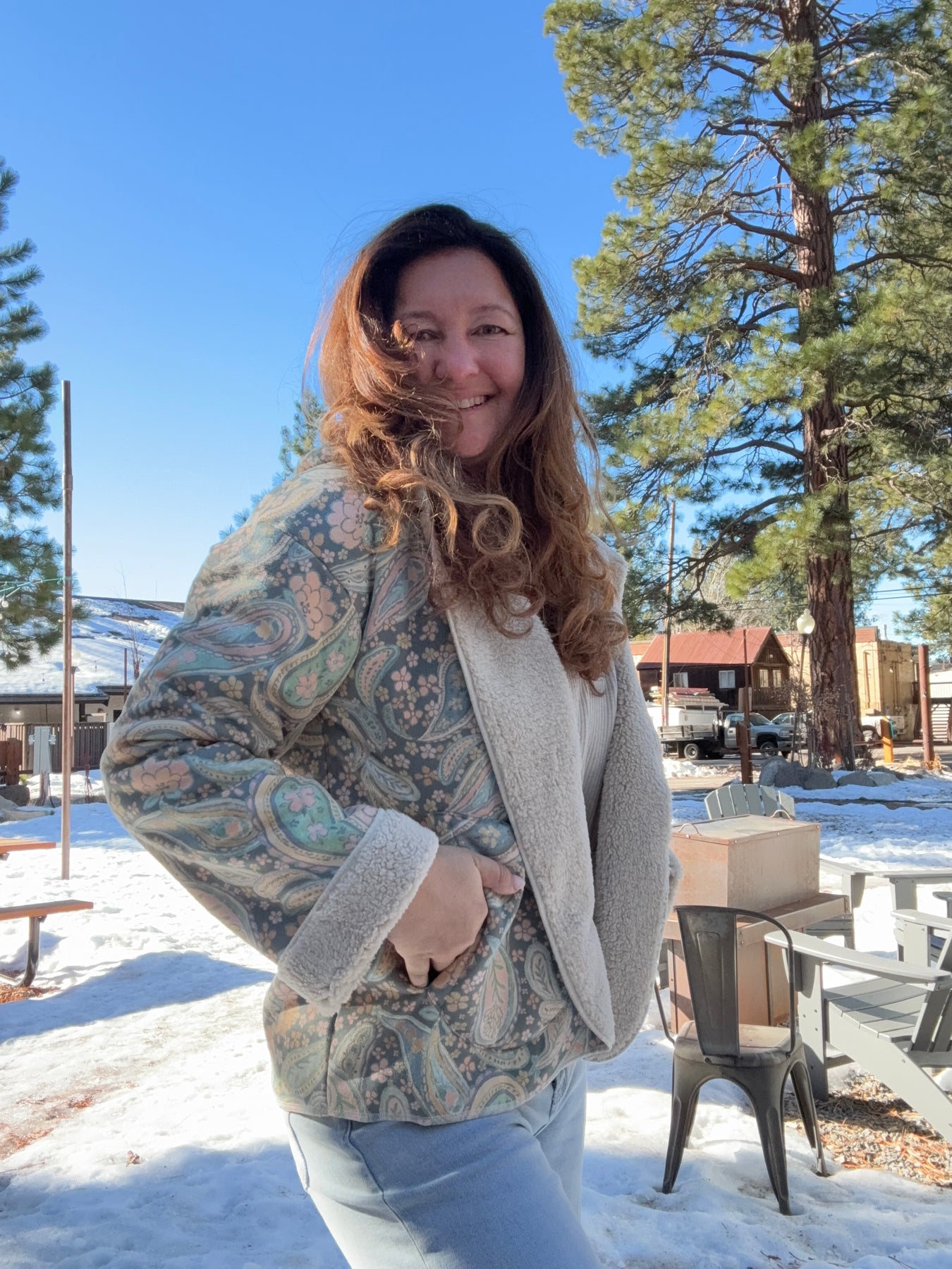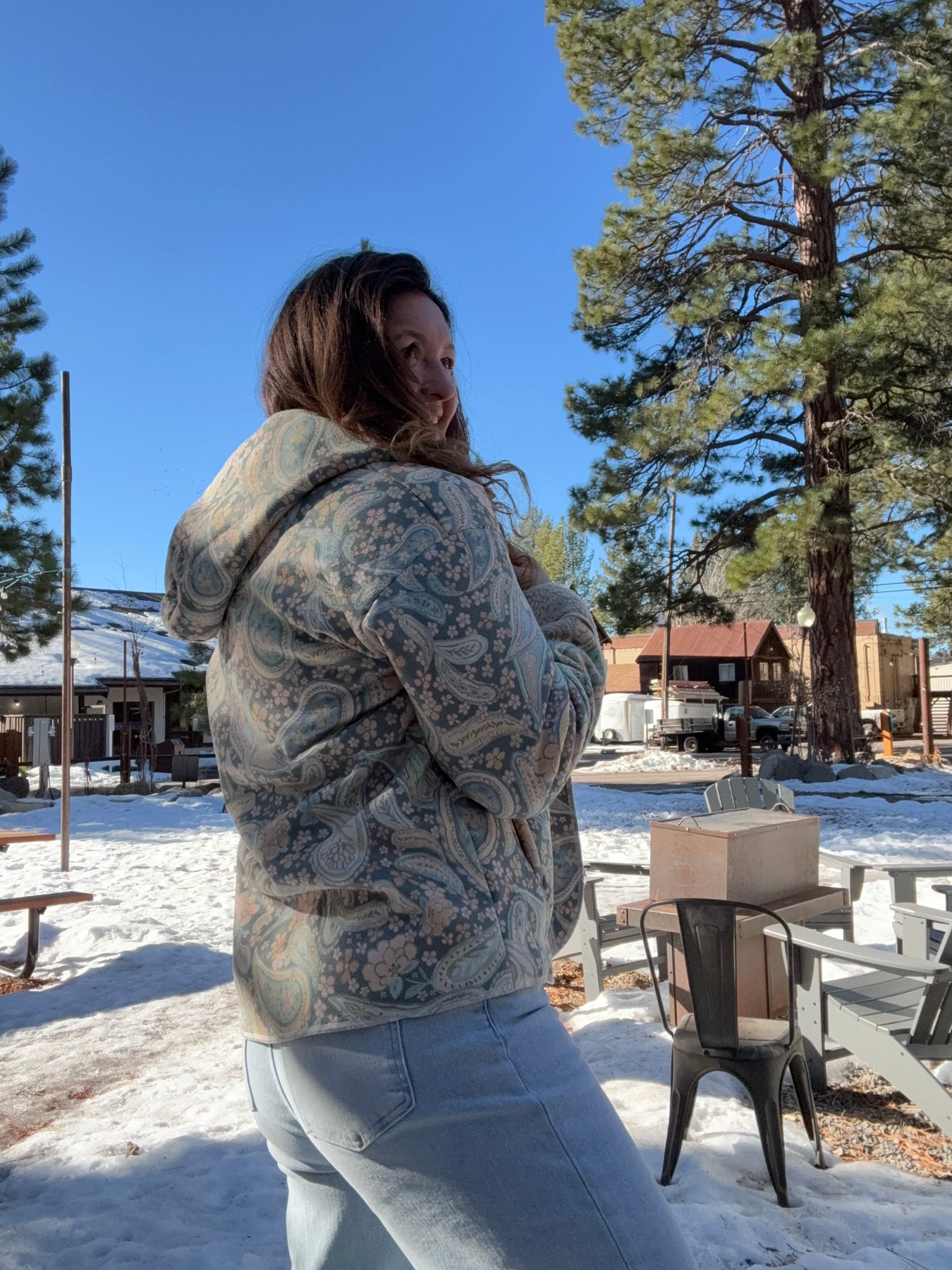 Keep cozy this fall with the Long Sleeve Hooded Jacket, designed with printed faux suede in a paisley floral print and a plush sherpa lining. The cozy shawl collar, patch pockets, and hood make it a comfortable and stylish option for cooler days.
