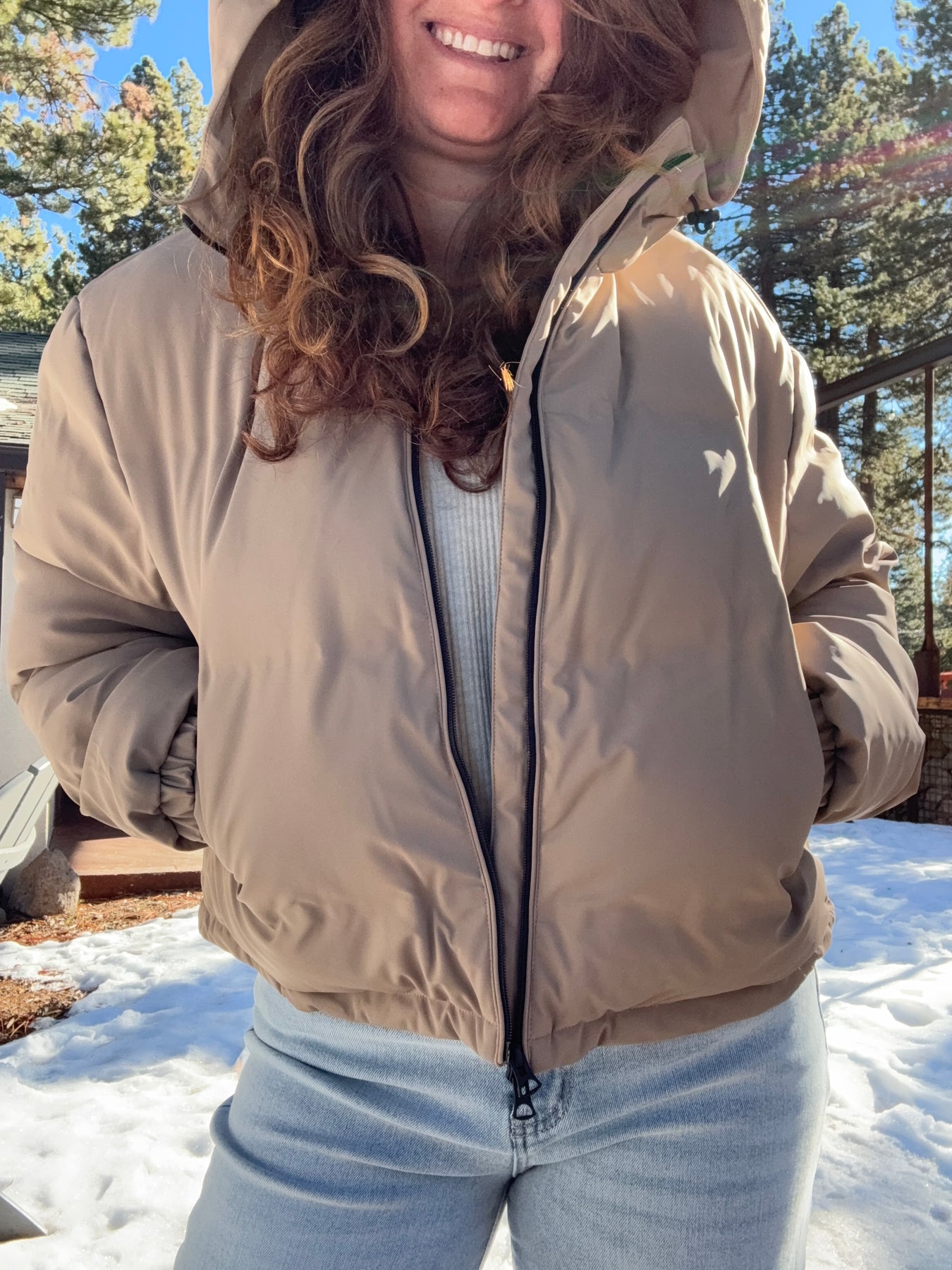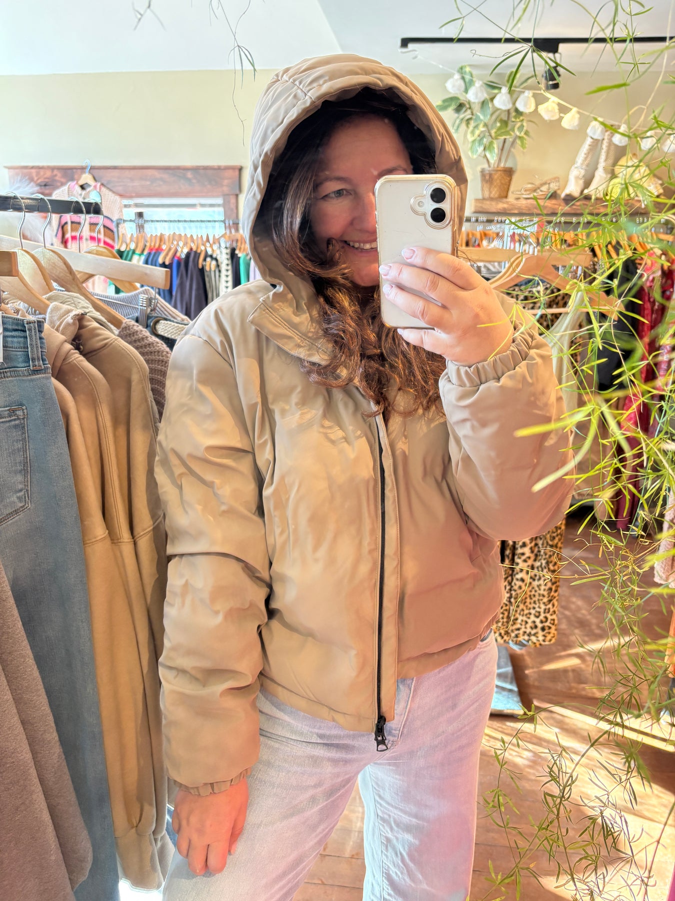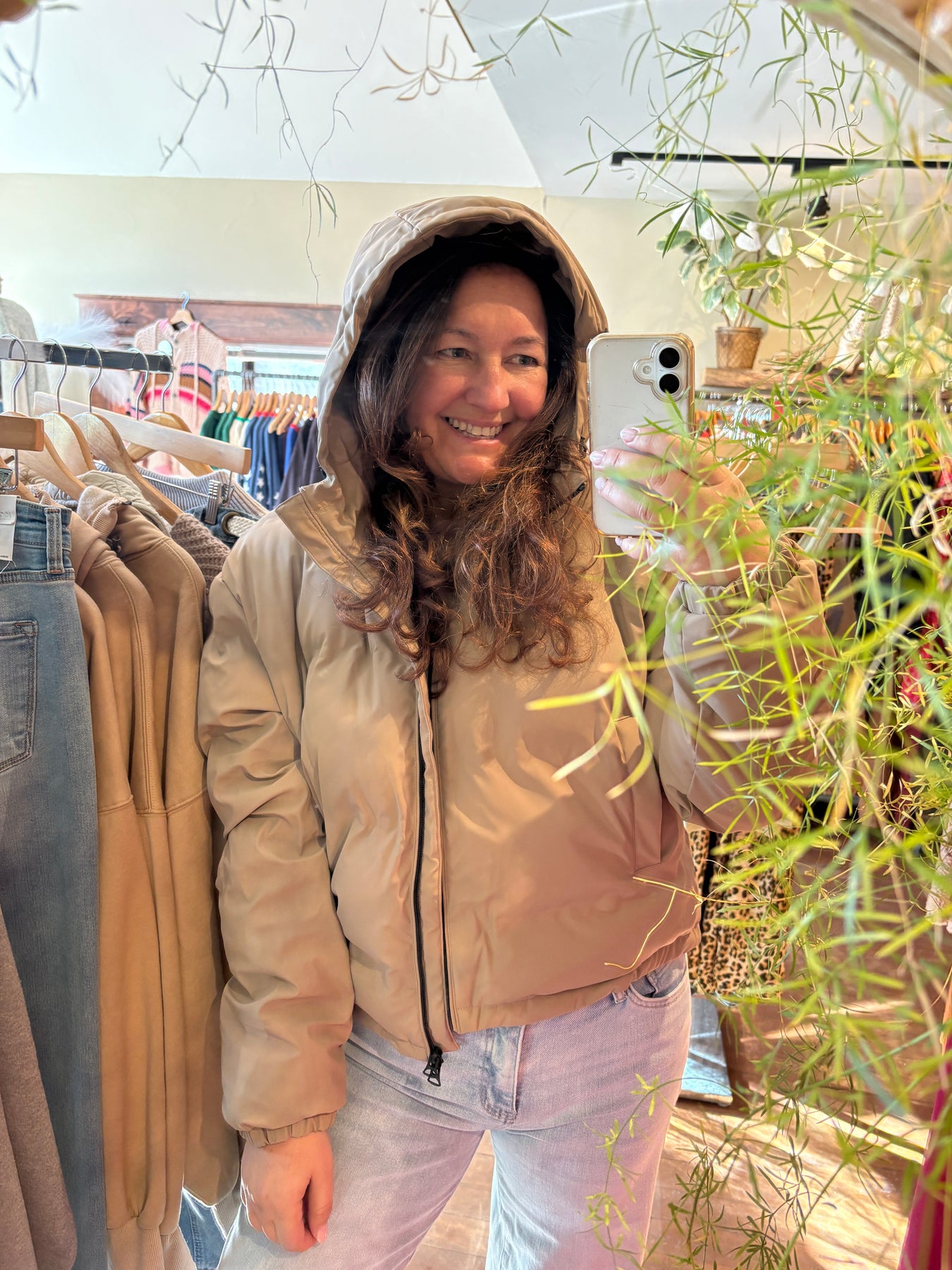 The perfect layering jacket for the smowy spring Season! This long sleeve puffer jacket features a zip-up closure, welted front pockets, an inner zip-up pocket, and an adjustable hood and hem with chord stoppers.