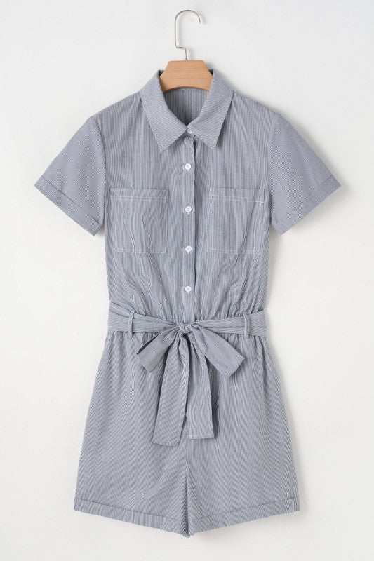 Embrace effortless style with this charming romper that balances fun and function. Featuring a buttoned front and practical chest pockets, it's designed for those who want to look put-together without sacrificing comfort. The belted high waist creates a flattering silhouette while allowing you to adjust the fit to your preference. Short sleeves and a relaxed cut make it perfect for everything from casual outings to weekend adventures. Whether you're running errands or meeting friends, this playful piece keeps you comfortable and chic all day long. 100% Cotton