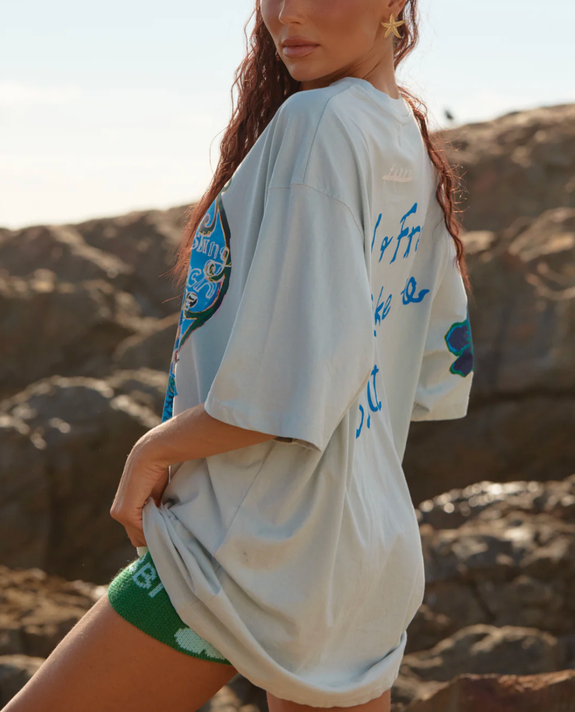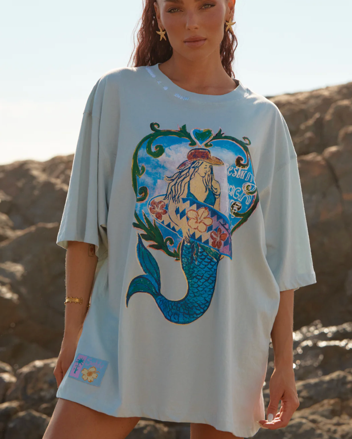 Designed in a very oversized, relaxed silhouette, this tee features a bold, hand-drawn mermaid graphic on the front and playful Wild & Free Just Like The Sea wording on the back.