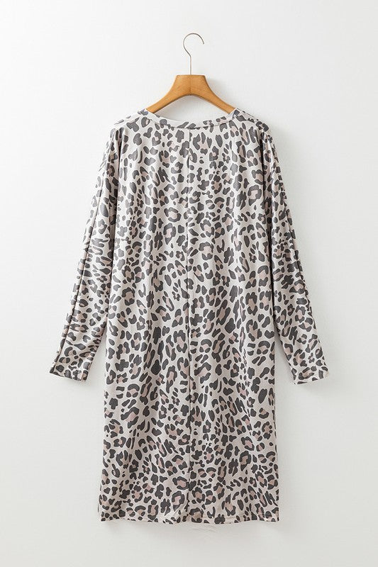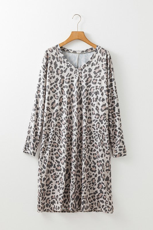 This long sleeve dress provides coverage and warmth while maintaining a sleek and stylish look. Embrace your wild side with a striking leopard print, that exudes confidence and individuality. Enjoy a relaxed and comfortable fit with a loose silhouette. The V-neckline adds a touch of allure and sophistication to the dress.