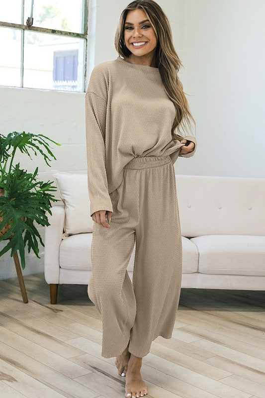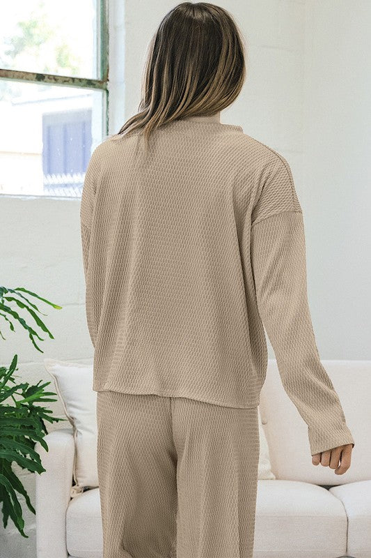 Embrace comfort and style with this Loose Textured Pullover and Pants Outfit The relaxed fit and textured fabric make it perfect for lounging or running errands The pullover features a loose, oversized fit and a textured knit design The pants have an elastic waistband for a comfy fit, and the loose straight-leg silhouette is perfect for a casual and laid-back look