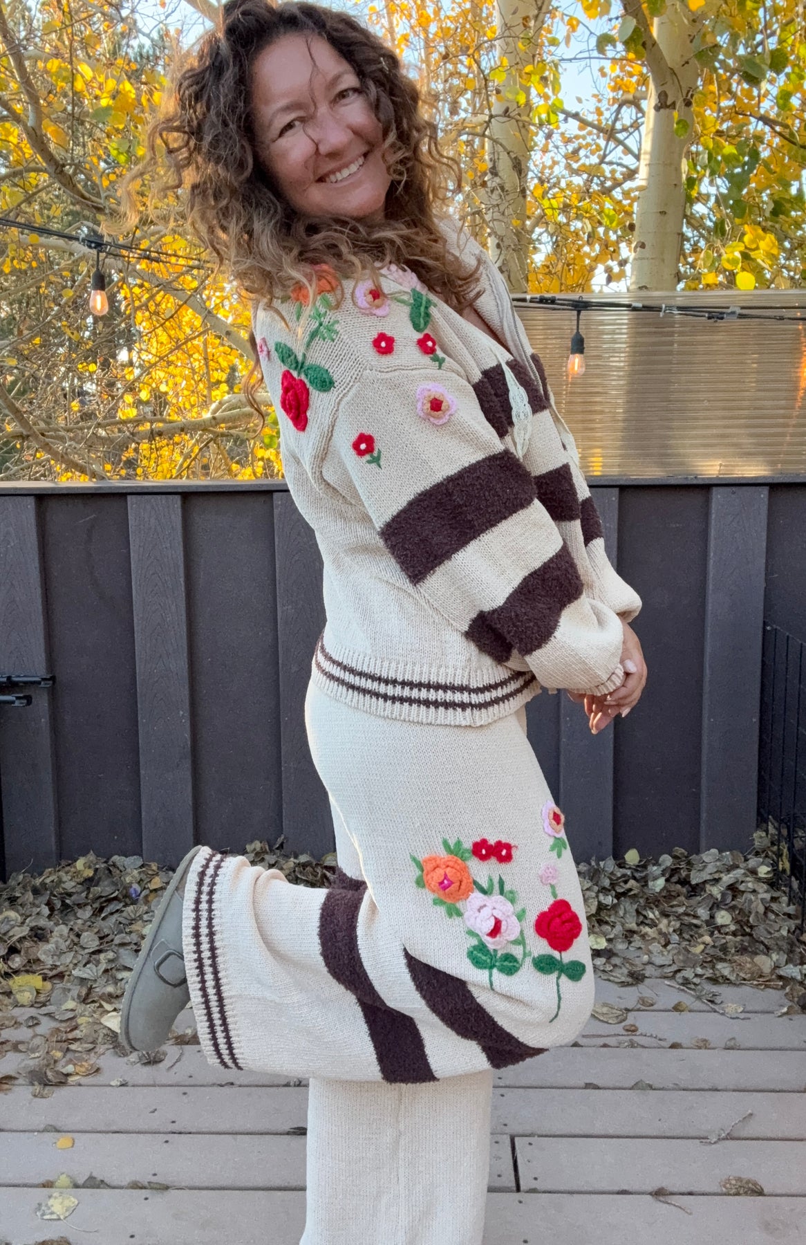 Slip into the coziest lounge pants that I’ve ever existed! Beautiful lace tie at the waist. Hand crocheted flowers on the legs. Incredibly soft, Chanel! You will be living in these!