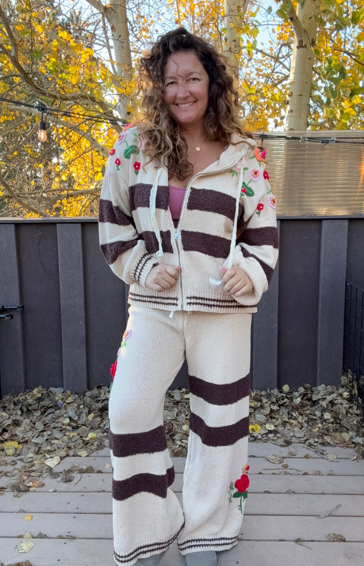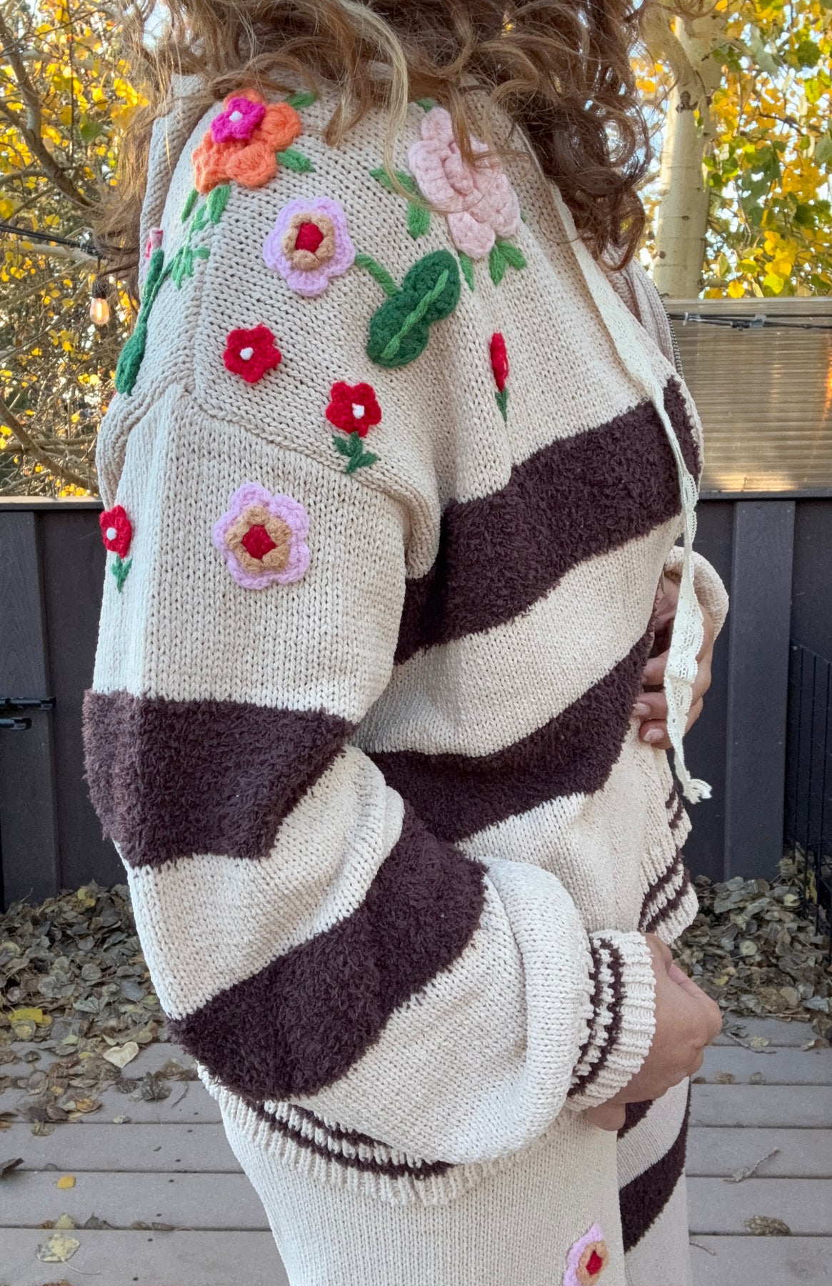 Fall in love with this beautiful striped hoodie sweater from POL Clothing. Designed with a relaxed fit and balloon sleeves, it features soft chenille stripes and delicate 3D floral embroidery on the sleeves and shoulders. The lace trim detailing and cozy hood add that signature POL touch — feminine, effortless, and full of charm.