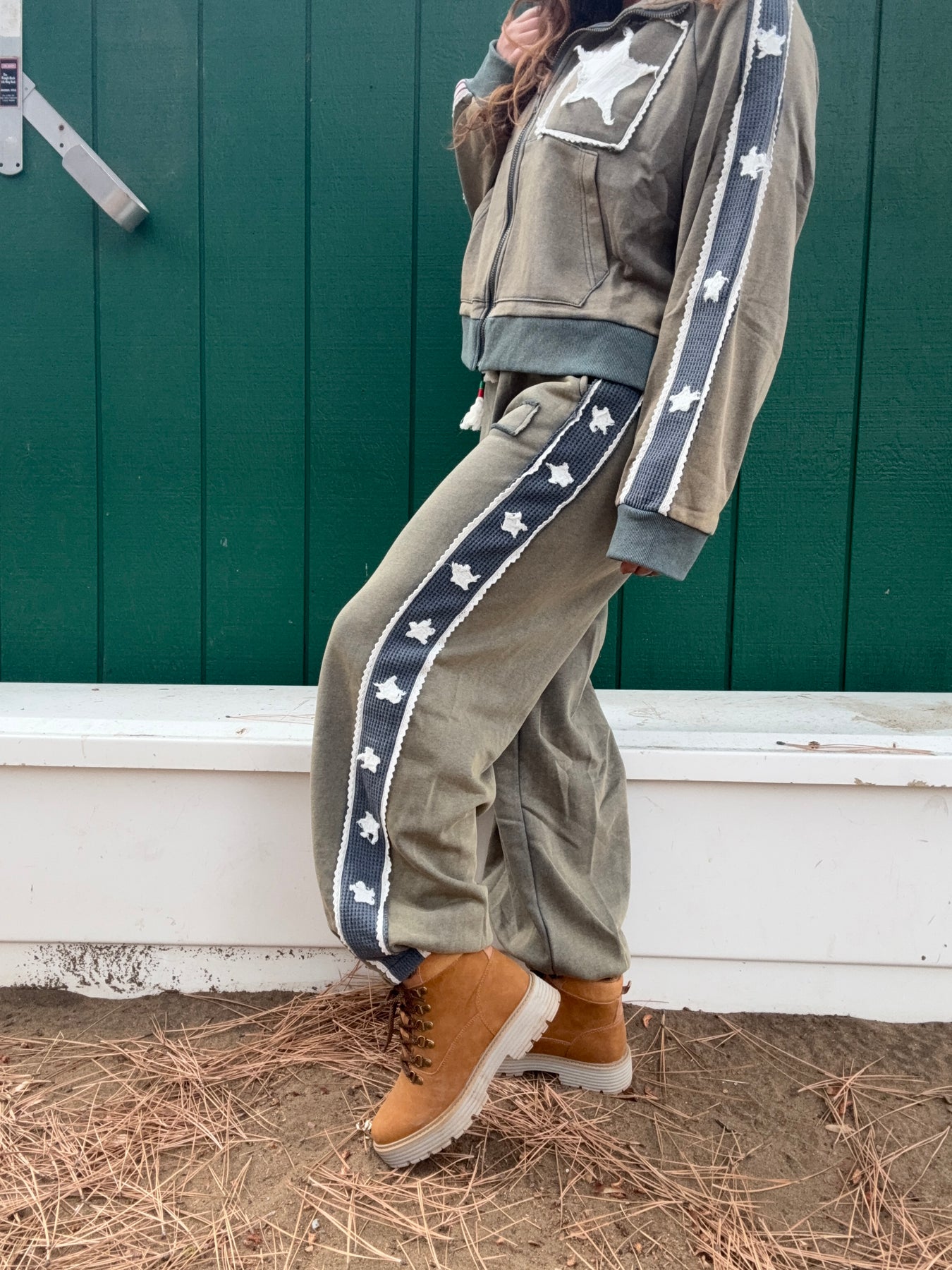 Stand out in comfort with our French Terry Striped Patch Trim Star Patch Knit Pants.