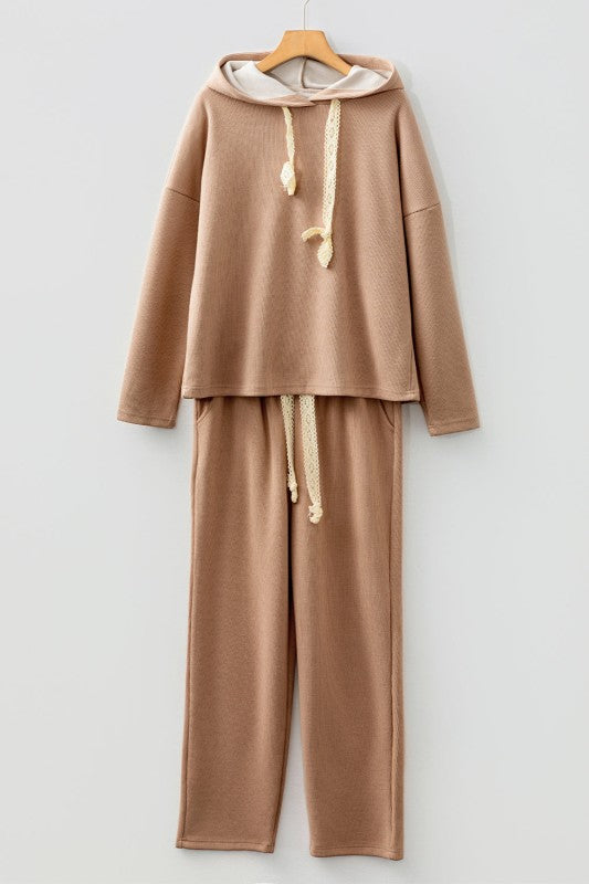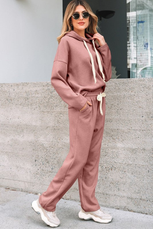 Elevate your casual wardrobe with this sophisticated two-piece corduroy suit. The set features a relaxed pullover hoodie with drop shoulders and an elegant lace drawstring detail, paired with high-waist tapered pants for a refined silhouette. Crafted from quality corduroy fabric, this coordinated ensemble transitions seamlessly from weekend lounging to casual outings. The leopard-accented drawstring adds a subtle touch of visual interest, while the thoughtful construction ensures both comfort and style. Perfect for those seeking versatile, put-together looks without compromising on ease. Polyester/Viscose/Poly/Spandex Size Info: See size chart for approximate measurements. Season: Fall, Winter, Spring, Summer