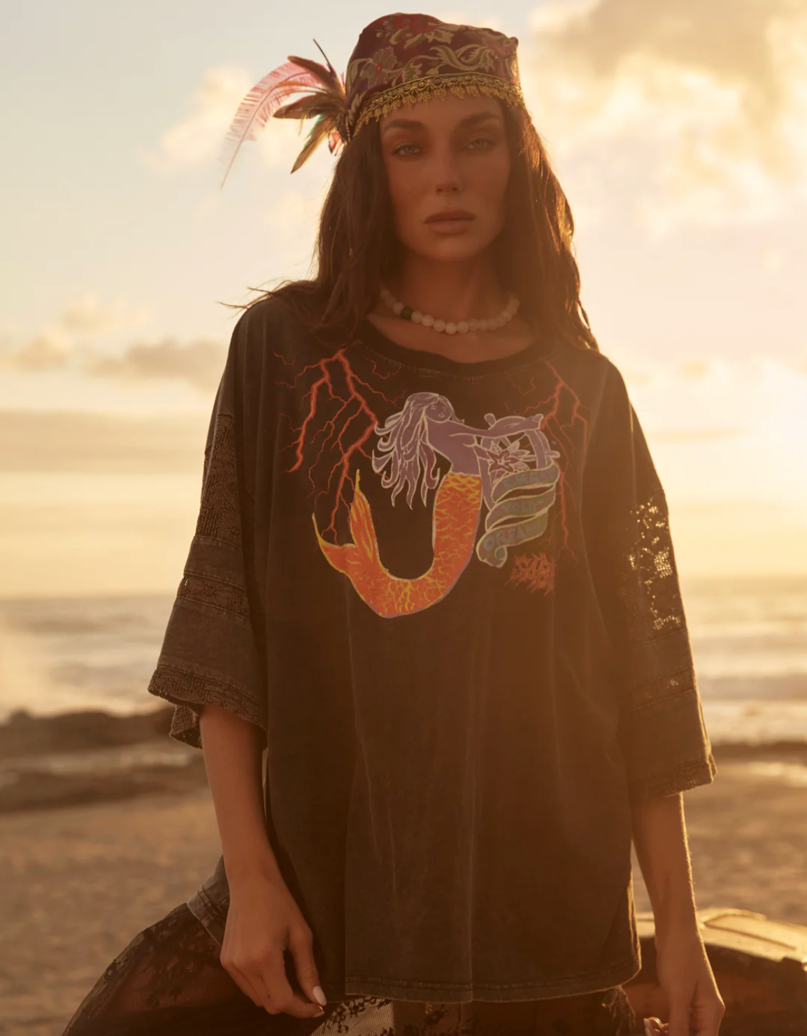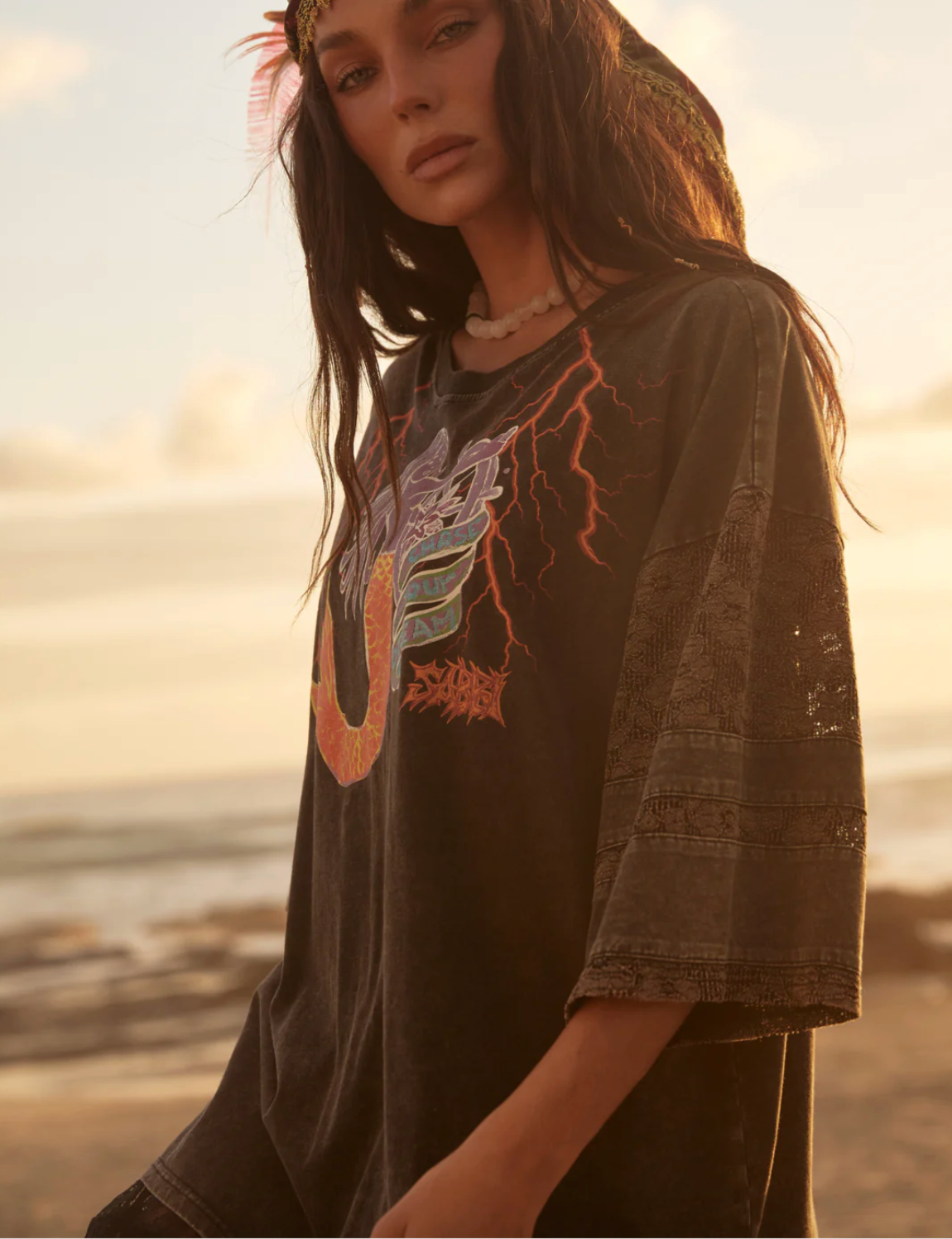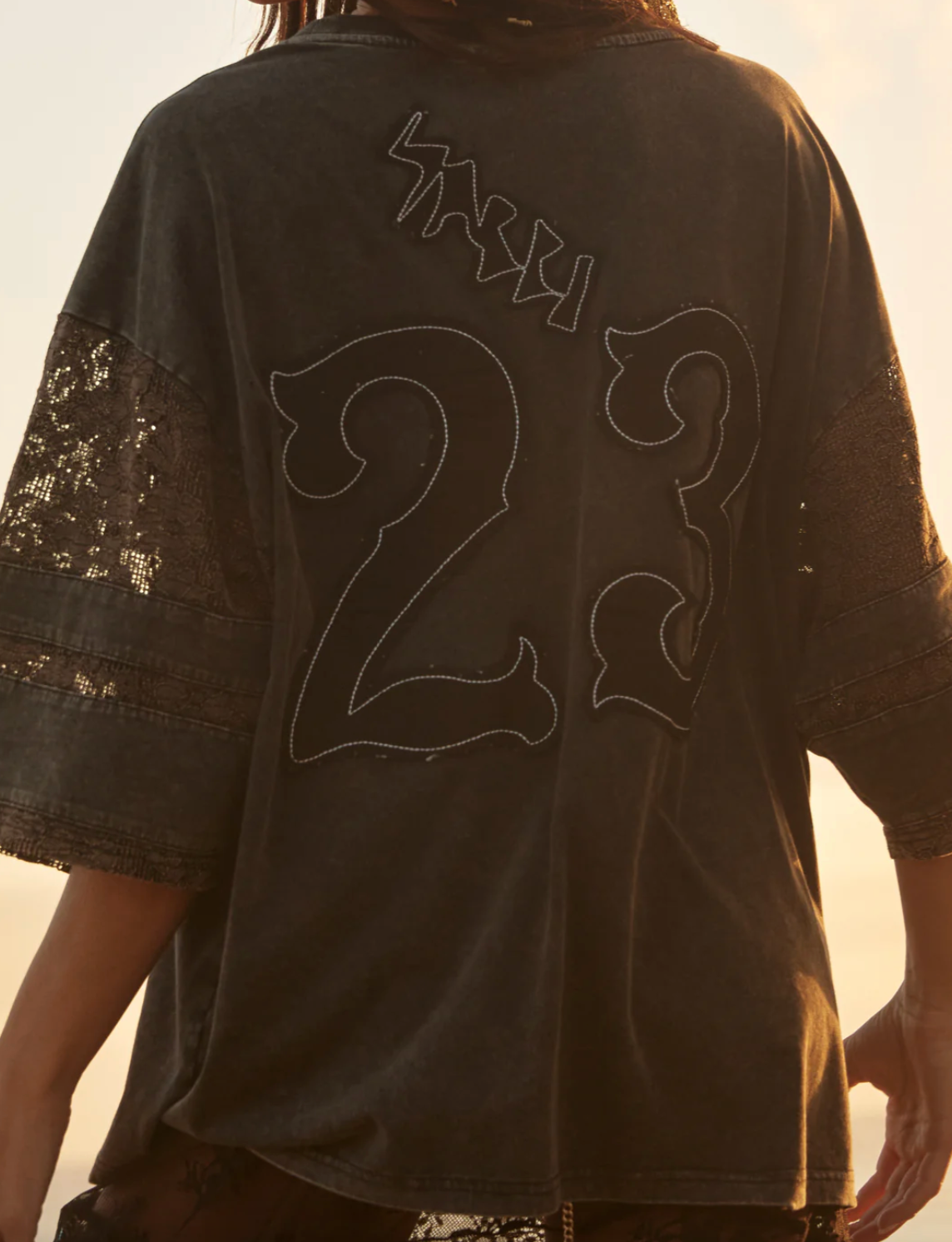 Cut in an oversized, slouchy silhouette, it features delicate lace sleeve detailing that adds a soft, romantic contrast to the bold graphic artwork. The washed cotton body gives it that lived-in, vintage feel, while the lace panels bring texture, movement and an unexpected feminine edge.